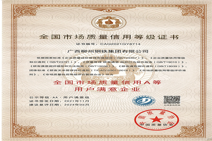 全國市場質(zhì)量信用AA級用戶滿意企業(yè)證書
